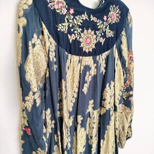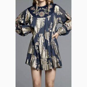ZARA Navy Velvet Mini Dress XS with Gold Thread & Embroidery