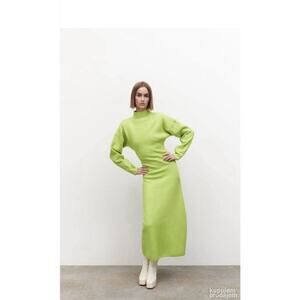 Vibrant neon green knit midi dress from ZARA, crafted from a soft wool and viscose blend. Features a sleek fitted silhouette, long sleeves, and a mock neckline for a modern, minimalist look. The fabric offers slight stretch for comfort and shape retention.