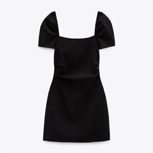 Mini dress with squared neckline and short balloon sleeves. Open back with adjustable crossed straps. Tonal interior lining. Back hidden in-seam zip closure.