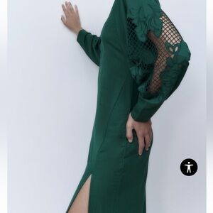 ZARA OPEN CROCHET LACE LONG SLEEVE MAXI DRESS FOREST GREEN MEDIUM NWT