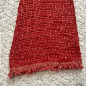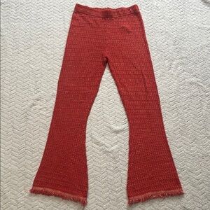 Stylish red textured flare pants with fringe hem. Perfect for a chic look.