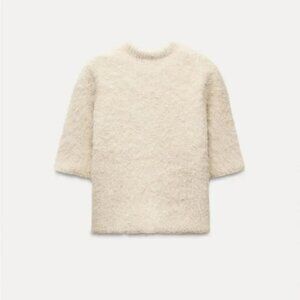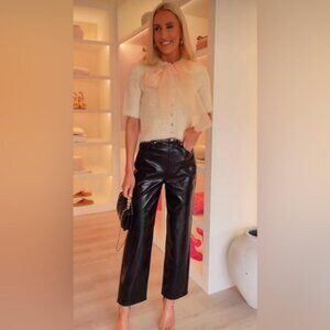 Round neck top with short sleeves. Combination organza bow detail. Front button closure.