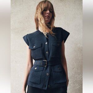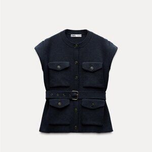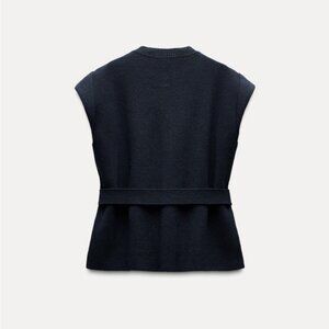 Sleeveless round neck vest with turned-up armholes. Front patch pockets with flaps. Front button closure and self belt.