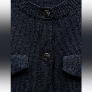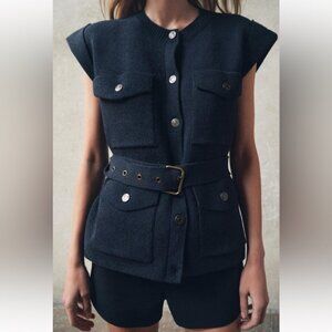 Sleeveless round neck vest with turned-up armholes. Front patch pockets with flaps. Front button closure and self belt.