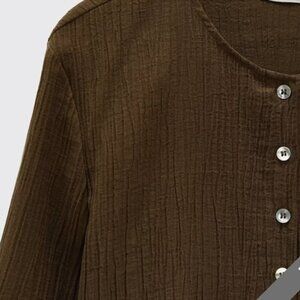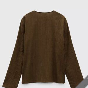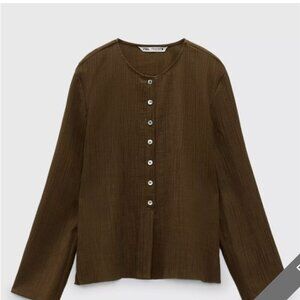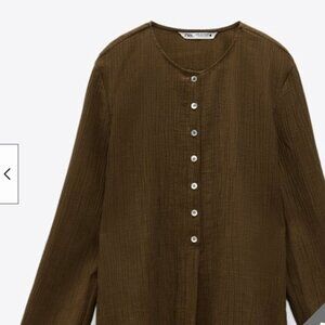 This Zara blouse features a rich olive green color and a textured fabric for a stylish, sophisticated look. The blouse has a round neckline and a button-up front, offering a timeless and versatile design. Perfect for both casual and formal occasions, it pairs well with both pants and skirts for a chic ensemble.