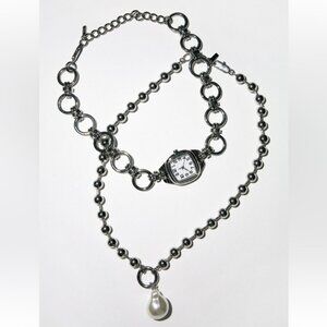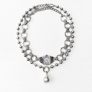 - Metal link necklace. Watch charm. Lobster clasp closure.