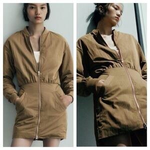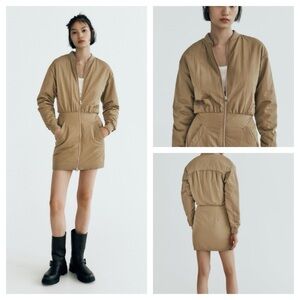 Stylish olive green bomber jacket. Features a front zipper and ribbed cuffs. Perfect for casual wear. NWT_ ZARA PADDED OLIVE GREEN MINI BOMBER DRESS SIZE L NWT