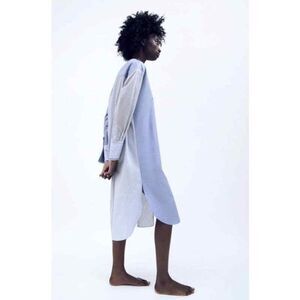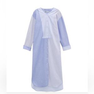 Long dress with round neck and long sleeves with cuffs. Asymmetric hem with side vents. Front button closure.