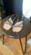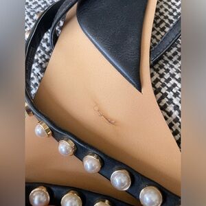 Stylish strapped black sandals adorned with elegant pearl details. Minor flaw inside one sole as pictured, worn 1x, overall in new preowned condition