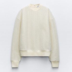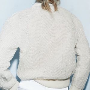 Round neck long sleeve sweater. Combination tulle fabric with pearl appliqués. Back button closure.