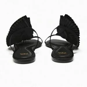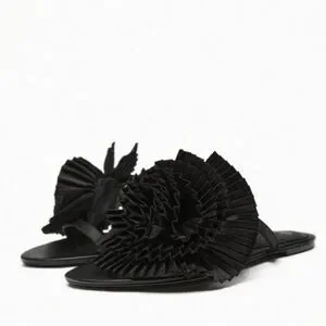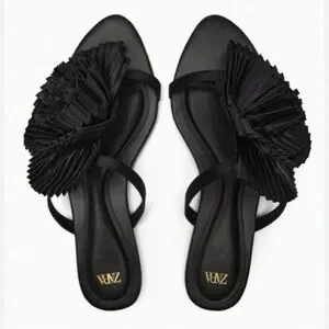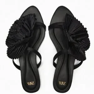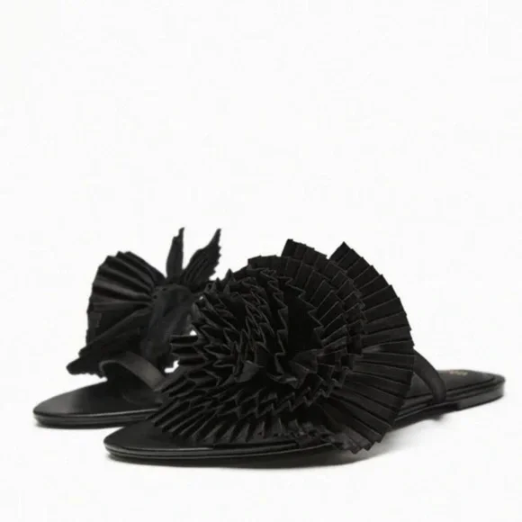 ZARA PLEATED FLOWER BLACK FLAT SANDALS Size 8/39 LIMITED EDITION Comes in Zara dust bag. Super Rare, worn once pre loved