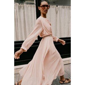 Dress with a round neck and long sleeves. Elasticated waist. Belt detail. Inner lining. Button-up front.