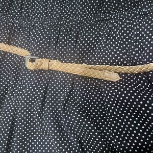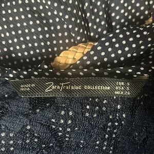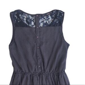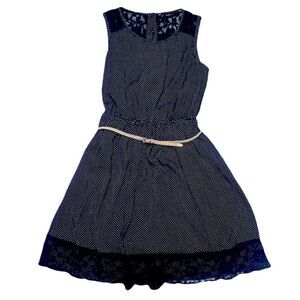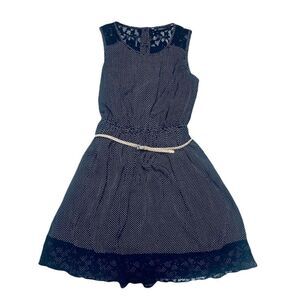 From the Zara Trafaluc collection, a flirty Polka Dot Sleeveless cinched waist minidress, elevated by lace inserts at the shoulders, back and bottom hem. Six buttons closure at the back and elasticated waist. Two loops at the sides hold the included braided belt. White Polka Dots against navy blue background. Fully lined. Knee length Flowy & Lightweight. Excellent preloved condition.