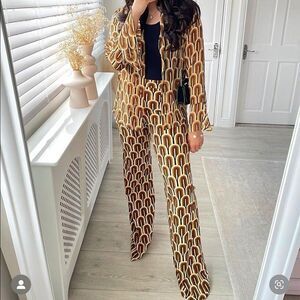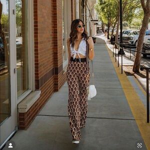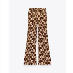 High-waisted printed pants. Flared legs. Side hidden in-seam zip closure.