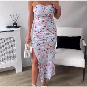 Midi dress made of linen blend fabric. Straight neckline and spaghetti straps that cross in back. Side ruching and back wide elastic smocking. Slit at hem. Side hidden in-seam zip closure.