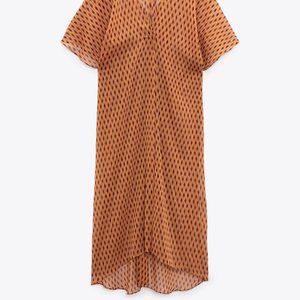 Midi tunic dress with V-neck and short sleeves. Front pleat detail.SHEERDRESS.