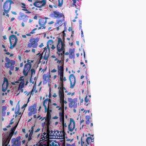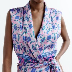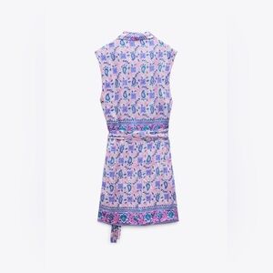 Sleeveless dress with lapel collar. Front pareo style closure with self tie.