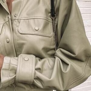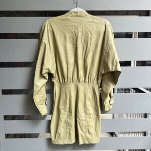 ZARA PU faux leather light olive / beige-ish long sleeve mini dress. Mock neckline. Snap buttons up front. Long sleeves with adjustable cuffs. Faux chest pockets. In great condition. Size XS - 14" waist; 15.5" hips; 21" drop pit to pit; 33.5" total length.