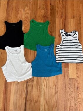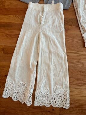 The white with lace like detail at the bottom is a size small. Waist on these are not stretchy.