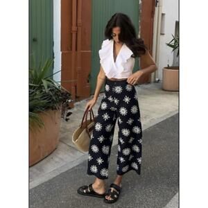 ZARA COLLECTION Pants Small Linen Blend Culotte Embroidered Wide Leg Cropped ZW Collection