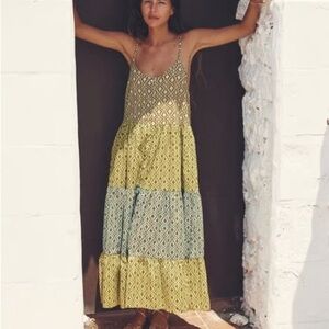 This Zara maxi dress features a tiered design with intricate geometric prints in earthy tones. With a relaxed fit and spaghetti straps, it offers a breezy and stylish look perfect for warm weather. The lightweight fabric and flowing silhouette ensure all-day comfort and elegance. Cotton midi dress. Round neckline and thin straps. Front button closure.