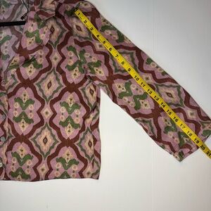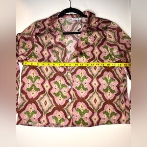 Stylish patterned button-up top featuring a blend of pink, green, and cream colors. See photos for approximate measurements.