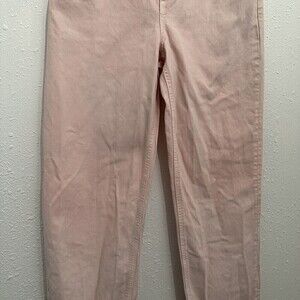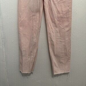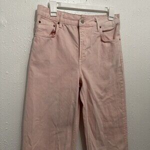 Great Pre-owned condition, minor wash wear/ fading. 100% cotton, denim is a thicker more rigid denim. Raw hem, straight leg. Light pink color.