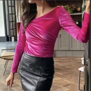 ZARA Pink Velvet Bodysuit Asymmetric Neck Long Sleeve Magenta Pink Size S