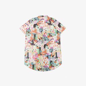 Stand out with this vibrant, eye-catching ZARA short-sleeve shirt dress! It features a bright, colorful pop art/graphic print with faces, text, and abstract shapes. The relaxed fit, camp collar, and rounded hem make it perfect for a bold streetwear look or a fun summer statement.