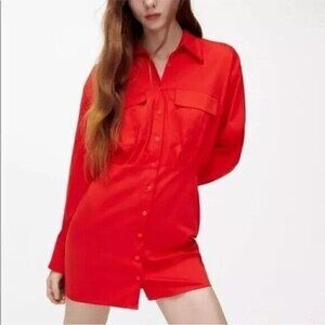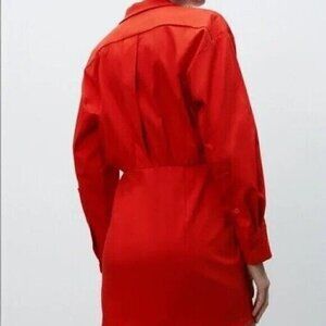 ZARA Poplin Shirt Dress Blouson Long Sleeve Mini Red Size XS NWT