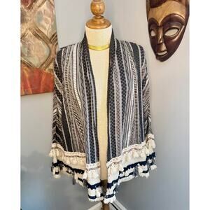 ZARA Premium Tassel Boho Trimmed Tribal Print Cardigan. Bohemian Chic cardigans from ZARA premium 100% cotton. ZARA deep navy & cream Aztec print kimono cardigan. Look at this cute bohemian vibe kimono with the most incredible fringed detail around the bottom and the cuffs! Very flowy and comfortable.