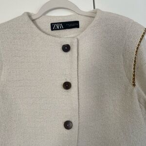 This elegant cream jacket offers a sophisticated touch to any outfit. Perfect for both casual and formal occasions.
