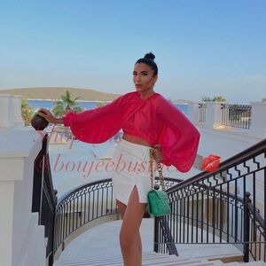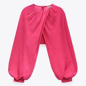 Crop top with round neck. Long balloon sleeves with elastic cuffs. Pleat detail. Hidden side in-seam zip closure and back opening and button.