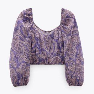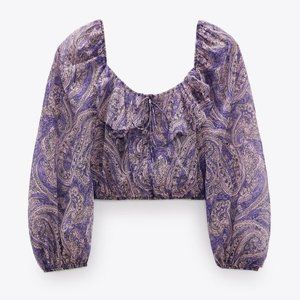 ZARA Purple NWT Cropped Sheer Blouse Top LARGE Boho Indie Floral Mauve Ruffle