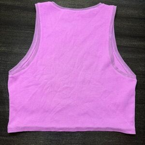Trendy and flattering Zara bralette-style crop top in a soft purple hue. Made with stretchy ribbed fabric and detailed with mesh trim along the neckline and armholes. Features a racerback and crew neck for a sporty, modern fit. Great for layering, loungewear, or festival looks!