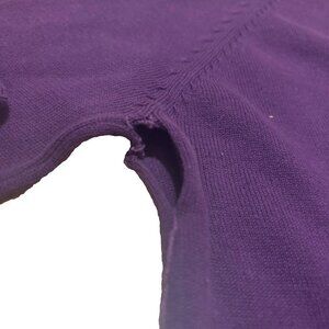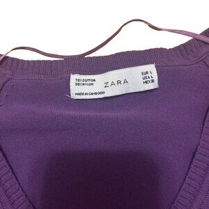 This is a ZARA women's sweater in size Large. It is a purple V-neck pullover style made of a soft blend of cotton and nylon with a knit fabric type. The sweater has long sleeves and a regular fit. Small hole under one armpit, as shown in photos. Priced to sell.