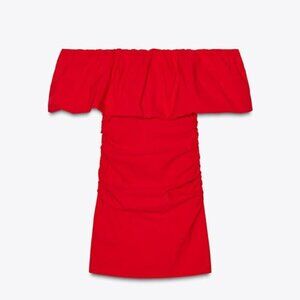 Straight neck elastic dress with ruffle. Ruched trim detail.