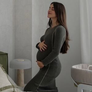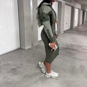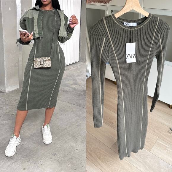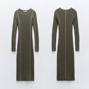 ZARA RIBBED KNIT PIPED STRETCH LONG SLEEVE MIDI DRESS KHAKI