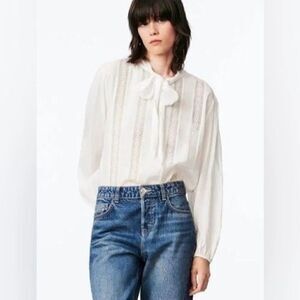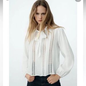 ZARA ROMANTIC LACE INSERT LANTERN SLEEVE TIE NECK BLOUSE