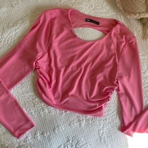 Pink cropped long-sleeved top by Zara. Selling because it was small for me. This top is pretty comfortable to wear and the color is perfect for the summer!