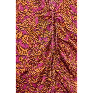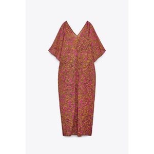 Dress with gathered V-neckline and drawstring. Short sleeves. Slit at hem.