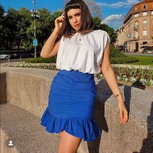 High-waisted mini skirt with ruching detail. Flounced hem. Hidden in-seam zip closure.