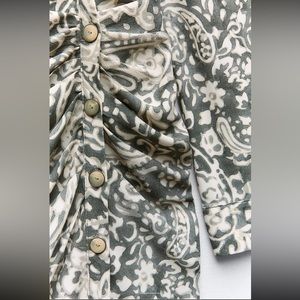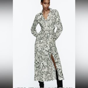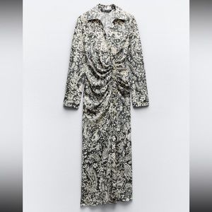 Dress with V-neck lapel collar and long sleeves. Front and back gathered detail. Front button closure. Fabric has a little bit stretch. 100% polyester