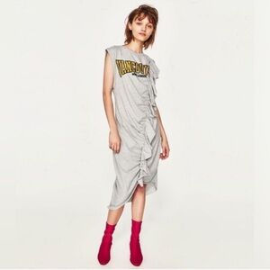 ZARA RUCHED/BODYCON Knit Sleeveless Tank DRESS Sz M Gray Yellow Ruffle Maxi/Midi