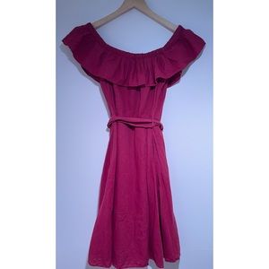 This adorable raspberry dress can be be dressed up or down, perfection for summer. Can be worn off the shoulder or ruffles higher. Just the perfect color.