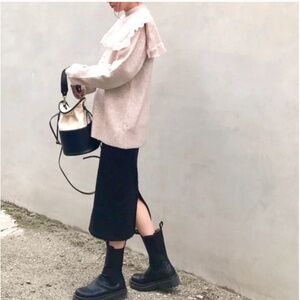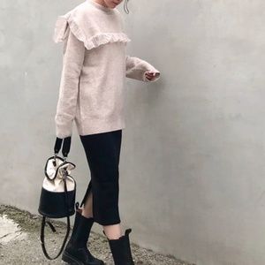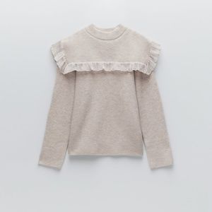 ROUND NECK LONG SLEEVE SWEATER. SELF APPLIQUÉ DETAIL WITH CONTRASTING RUFFLE. RIBBED TRIM.