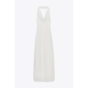 Dress with a flowing neckline and scarf in the same fabric. Open back. Short tonal lining. Straight hem.