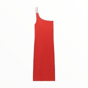 Striking red midi dress featuring an asymmetric neckline with a single shoulder strap for a bold, contemporary silhouette. Crafted in a soft cable knit fabric that hugs the figure, this dress blends comfort with modern edge. Ideal for evening events, date nights, or stylish layering during cooler seasons.