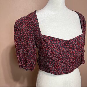 ZARA Red Floral Cropped Peasant Top Puff Sleeve Sweetheart Neck Blouse Large