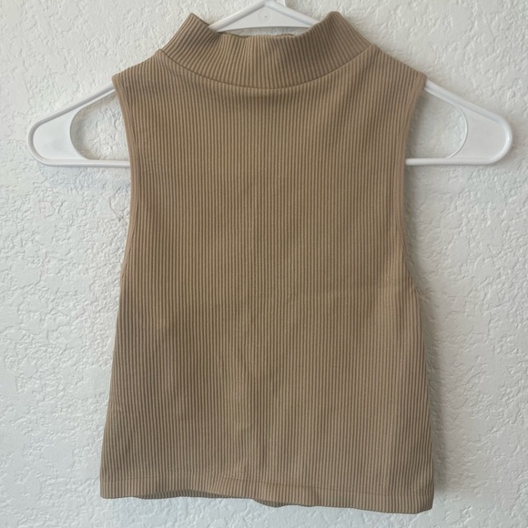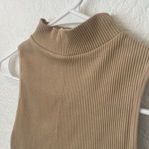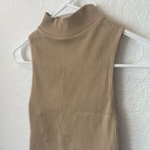 ZARA robbed tank top with high neck in tan color. Very stretchy, but fitting so able to wear without bra if desired. Size is large but can fit medium if desired due to fitted and elastic nature of top.